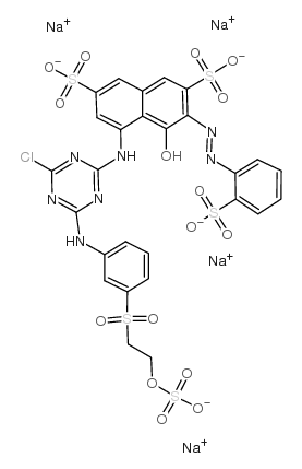制法/工艺 以邻氨基苯磺酸、H 酸、三聚氯氰和间(2-硫酸酯乙基砜基)苯胺为原料,首先将邻氨基苯磺酸重氮化,再与 H 酸偶合,然后将偶合产物与三聚氯氰进行第一次缩合,最后用间(2-硫酸酯乙基砜基)苯胺进行第二次缩合得产物。经盐析、过滤、干燥得成品。